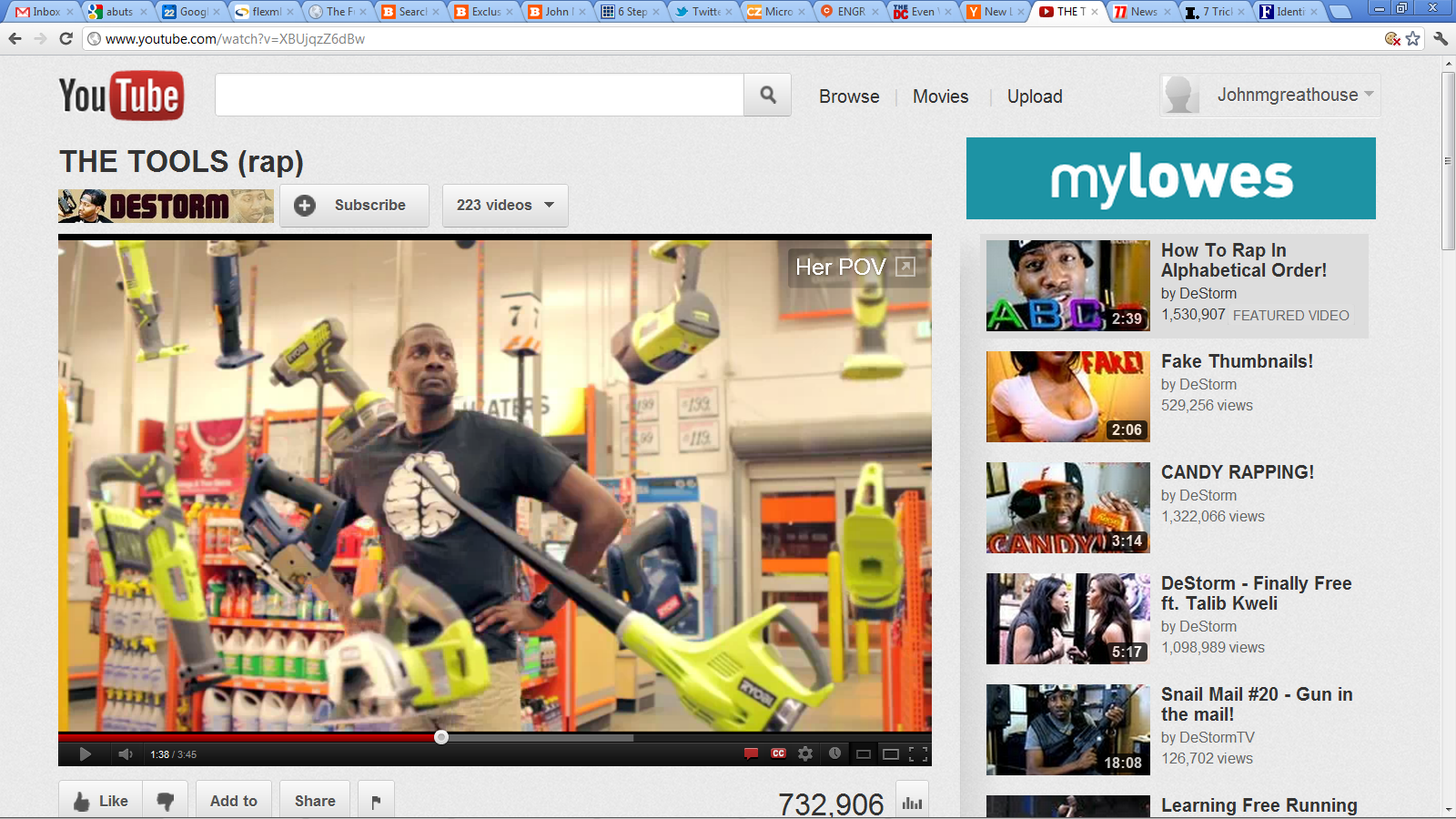 One of the best examples of this integration is DeStorm’s November 2011 video in which he raps about Ryobi tools while running through the aisles at Home Depot. True to the cross-promotional nature of the YouTube landscape, fellow YouTuber MysteryGuitarMan makes a cameo appearance.